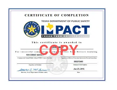 Certificate of completion from the Impact Texas Teen Drivers (ITTD) video